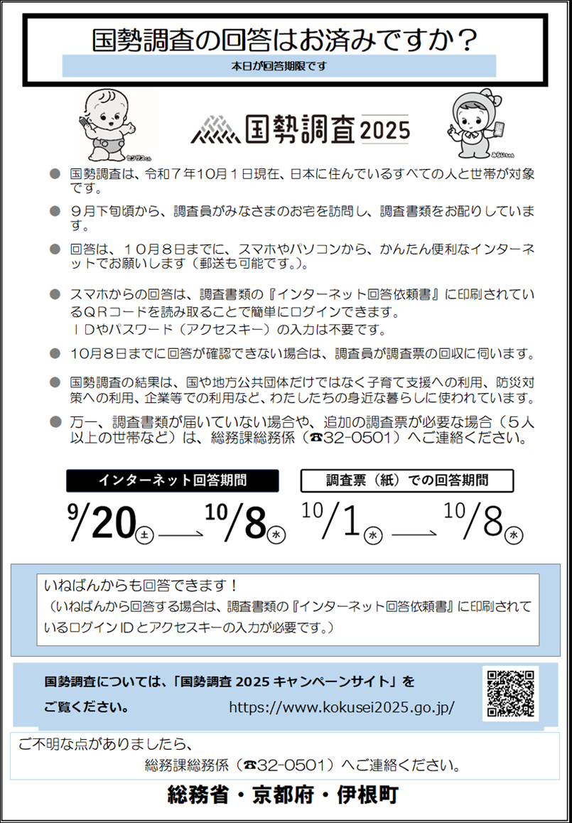 国勢調査の回答期限は10月8日(水)です。 インターネット回答は24時間いつでも回答できます。 まだ回答がお済みでない方は、パソコンやスマホ、いねばんからインターネット回答ができますのでご利用ください。 回答がいただけていない世帯には、調査員が回答のお願いに伺います。 皆さまのご理解とご協力をよろしくお願いいたします。