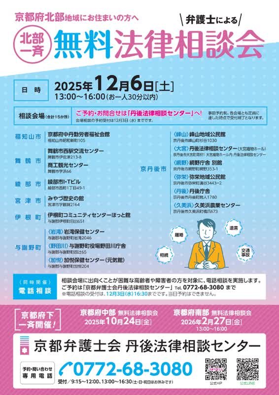 12月6日(土)に弁護士による無料法律相談会が開催されます。 詳しくは添付のチラシをご確認ください。