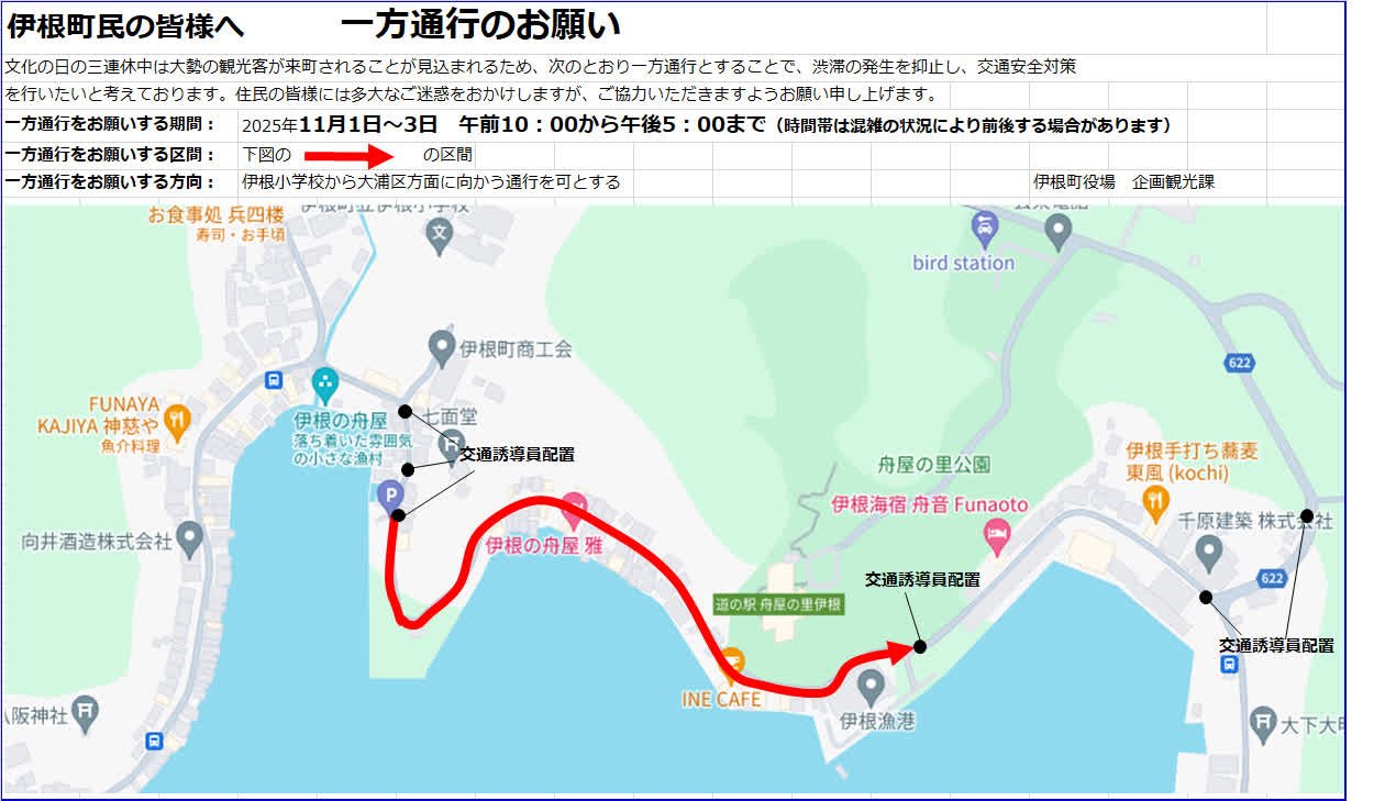 一方通行誘導にご協力お願いします。 【期間】 11月1日から3日まで 【区間】 七面山駐車場前から漁協製氷庫前まで 【時間】 午前10:00から午後5:00まで (時間帯は混雑の状況により前後する場合があります)