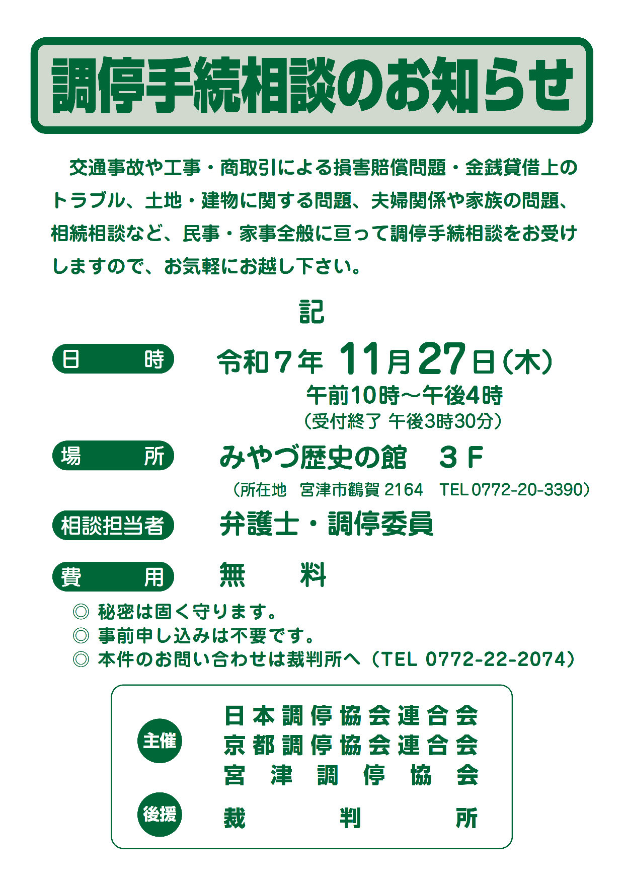 交通事故や工事・商取引による損害賠償問題・金銭貸借上のトラブル、土地・建物に関する問題、夫婦関係や家族の問題、相続相談など、民事・家事全般に亘って調停手続相談をお受けしますので、お気軽にお越し下さい。
