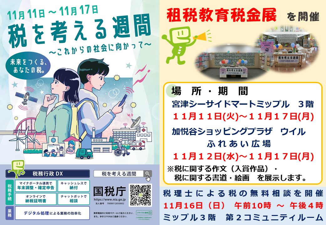 宮津税務署では、11月11日(火)~17日(月)の期間、税に関する幼稚園児の絵画、小学生の書道作品、中高生の作文を商業施設へ展示するイベントを開催します。