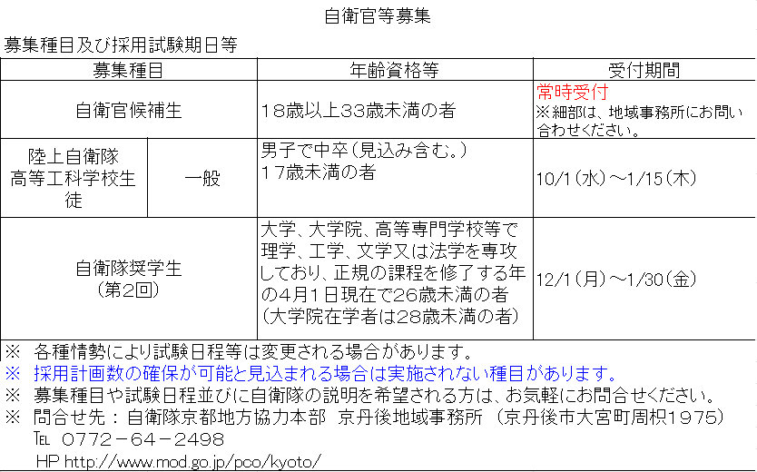 詳しくは自衛隊京都地方協力本部までお問い合わせください。