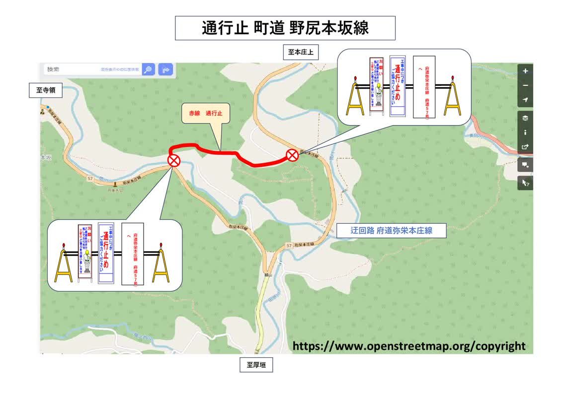 橋の補修工事を行うため、桜が丘運動公園を通る町道野尻本坂線が、通行止めになりますのでご注意ください。 ●通行止日時 12月11日(木)9時から12月12日(金)17時の間終日通行止め ※荒天の場合は順延します。 ●府道弥栄本庄線へ迂回してください。