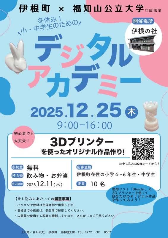 伊根町と福知山公立大学の共同事業として実施する「冬休み小・中学生のためのデジタルアカデミー」の参加者を募集しています。