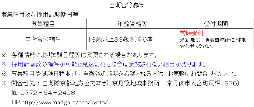 自衛官の募集情報をお知らせします。 自衛官候補生の募集受付が行われています。 ○自衛官候補生:常時受付 詳しくは自衛隊京都地方協力本部までお問い合わせください。