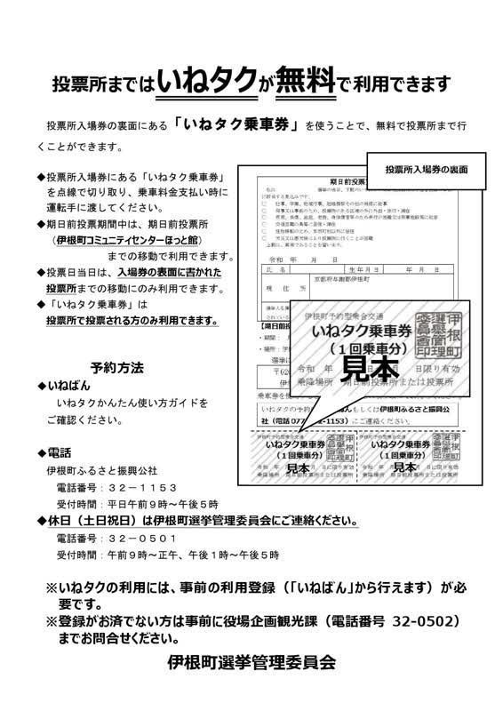 乗車の際、投票所入場券に印刷された「いねタク乗車券」を切り取り、運転手にお渡しください。