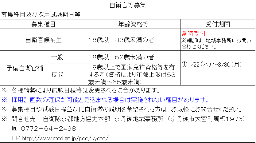 詳しくは自衛隊京都地方協力本部までお問い合わせください。