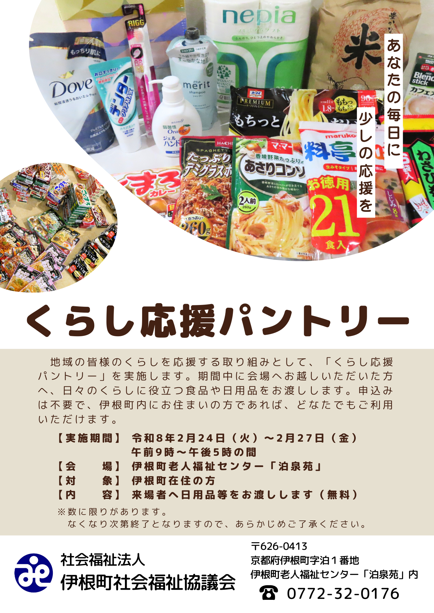 地域の皆様のくらしを応援する取り組みとして、「くらし応援パントリー」を実施します。期間中に会場へお越しいただいた方に、日々のくらしに役立つ食品や日用品をお渡しします。申込みは不要で、伊根町内にお住まいの方であれば、どなたでもご利用いただけます。