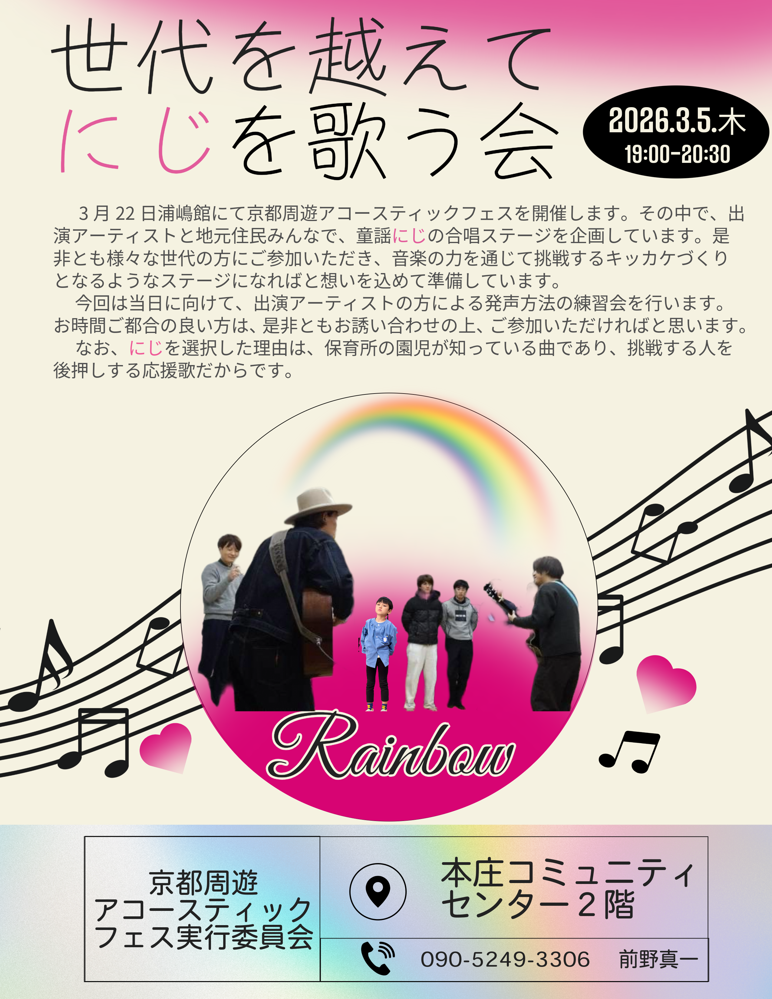 フェスに先駆けて、1月23日に開催したボイストレーニング&ミニコンサートに続き、下記の日程で「世代を越えてにじを歌う会」を企画しました。