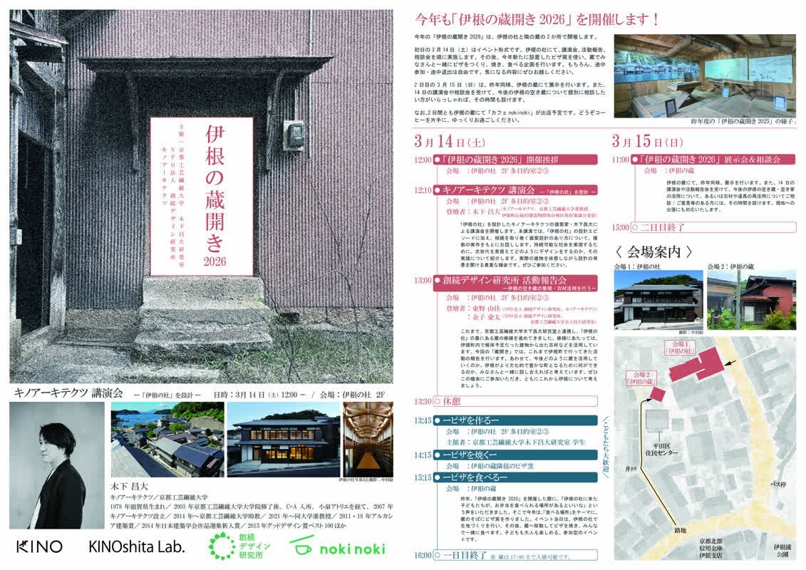 今年の「伊根の蔵開き2026」は、伊根の杜と隣の蔵の2会場で開催します。3月14日(土)は伊根の杜にて、12時より、当施設を設計したキノアーキテクツの建築家・木下昌大氏による講演会を行います。続いて13時より、京都工芸繊維大学木下研究室及び研究室OBを中心に設立したNPO法人 創続デザイン研究所による、蔵の修繕活動報告会、今後の伊根町内の蔵の活用方法の相談会を行います。その後、蔵に新設したピザ窯を使い、ピザづくりの参加企画も実施予定です。途中参加・退出は自由です。15日(日)は11時~15時、蔵にて昨年同様に展示と引き続き相談会を行います。両日ともカフェnokinokiが出店予定です。コーヒーを片手に、ゆっくりとお過ごしください。